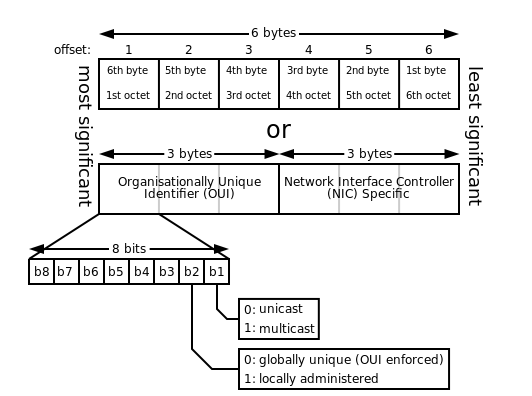 Adres sprzętowy czy fizyczny składa się z 48 bitów podzielonych na dwie połowy: od lewej kod producenta (ang. OIU) i kolejno numer nadawany przez producenta.