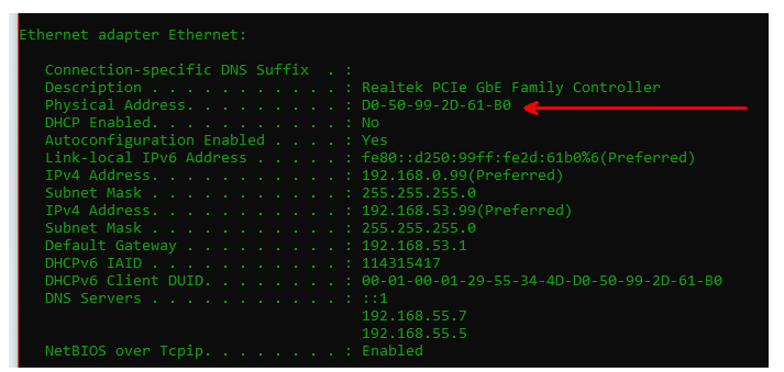 Przykładowy adres MAC pod MS Windows za pomocą polecenia ipconfig /all: