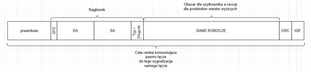 Jednym z najważniejszych, a często niedocenianych czynników wpływających na goodput, jest średni rozmiar pakietów w sieci. Każda porcja danych przesyłana przez sieć Ethernet musi zostać opakowana w strukturę zwaną ramką (frame). Ramka, oprócz właściwych danych (payload), zawiera szereg pól nagłówkowych koniecznych do jej zaadresowania i dostarczenia. Suma tych pól stanowi stały narzut, niezależny od ilości przesyłanych danych. Można to porównać do wysyłania paczek: niezależnie od tego, czy wysyłamy mały list, czy dużą paczkę, musimy użyć koperty i znaczka (narzut), które mają swoją wagę i koszt. Przesłanie 1 kg towaru w dziesięciu paczkach po 100g będzie znacznie mniej efektywne niż wysłanie go w jednej paczce 1 kg, ponieważ w pierwszym przypadku dziesięciokrotnie poniesiemy koszt „opakowania”. W sieci jest identycznie – transmisja dużej ilości małych pakietów (np. w telefonii VoIP) generuje procentowo znacznie większy narzut niż transfer dużych plików, co prowadzi do niższego goodputu, mimo że throughput może pozostać wysoki.