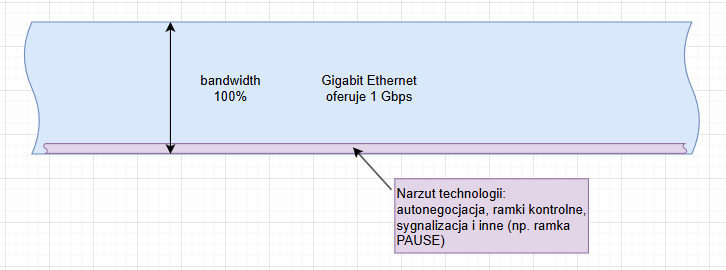 Standardowa ramka Ethernet II posiada narzut o łącznej wielkości 18 bajtów (adresy MAC, EtherType, suma kontrolna) plus 8 bajtów na preambułę i ogranicznik początku ramki (SFD), co daje łącznie 26 bajtów narzutu na poziomie fizycznym dla każdej przesyłanej ramki. Minimalna wielkość pola danych (payload) to 46 bajtów. W takim skrajnym przypadku, efektywność transmisji wynosi zaledwie 46 / (46 + 26) = 63.8%. Oznacza to, że ponad 36% pasma jest marnowane na same nagłówki! Z kolei dla maksymalnej standardowej wielkości pola danych, czyli 1500 bajtów (wartość znana jako MTU – Maximum Transmission Unit), efektywność rośnie do 1500 / (1500 + 26) = 98.3%. Ta prosta kalkulacja dobitnie pokazuje, dlaczego dla uzyskania wysokiej przepustowości użytecznej (goodput) kluczowe jest wykorzystywanie jak największych pakietów. Dlatego też technologie takie jak Jumbo Frames (ramki o MTU do 9000 bajtów) są powszechnie stosowane w sieciach SAN (Storage Area Network) i w klastrach obliczeniowych, gdzie liczy się każda cząstka wydajności.