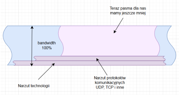 O ile bandwidth jest teoretycznym maksimum, o tyle Throughput, czyli przepustowość rzeczywista, to metryka opisująca faktyczną ilość danych, która została pomyślnie przesłana przez sieć w danym okresie. Wracając do naszej analogii autostrady, throughput to realna liczba samochodów, która minęła określony punkt pomiarowy w ciągu godziny. Ta wartość jest z natury dynamiczna i niemal zawsze niższa od teoretycznej przepustowości. Przyczyną tej różnicy jest nieunikniony narzut protokołów komunikacyjnych (protocol overhead), opóźnienia (latency), kolizje pakietów, retransmisje oraz ograniczenia wydajnościowe samych urządzeń końcowych. Każdy pakiet danych, zanim zostanie wysłany, musi zostać „opakowany” w dodatkowe informacje – nagłówki warstw modelu OSI/ISO, które same w sobie zużywają część dostępnego pasma. To nie tylko poniżej pokazane protokoły UDP czy TCP ale masa innych.